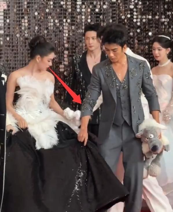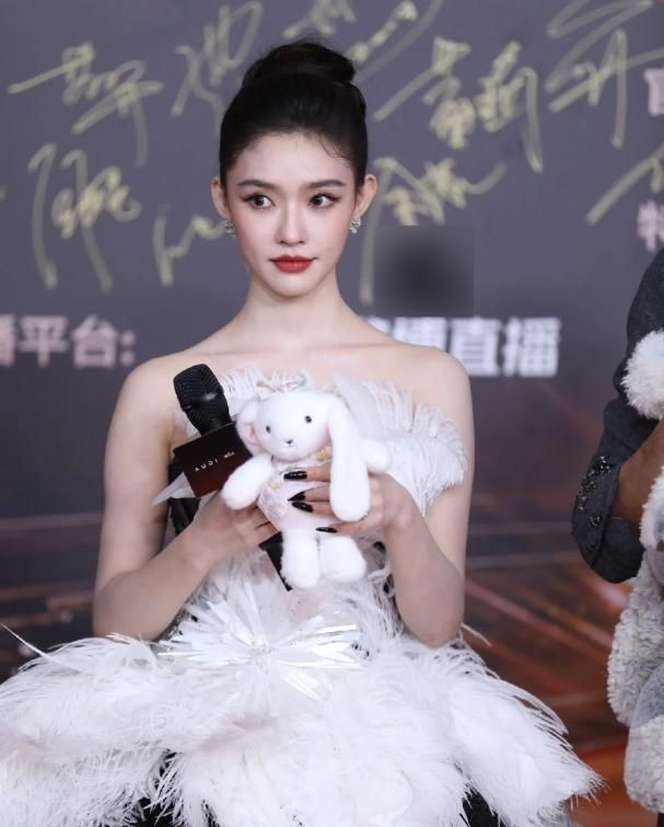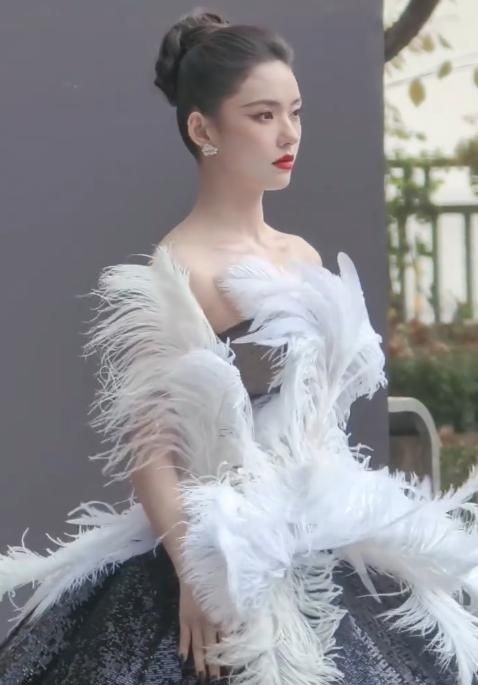 她身穿黑白撞色长裙,采用裹胸设计,前襟点缀巨大白色羽毛装饰,视觉冲击强烈,几乎刺眼。 这套造型确实凸显了她纤细的腰肢和优越的锁骨线条,远看极具美感,颇具高级感。