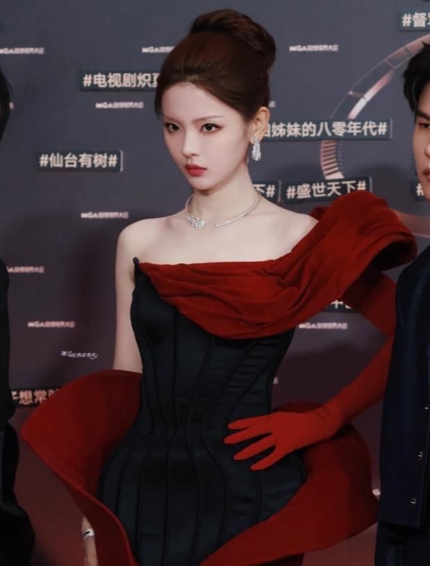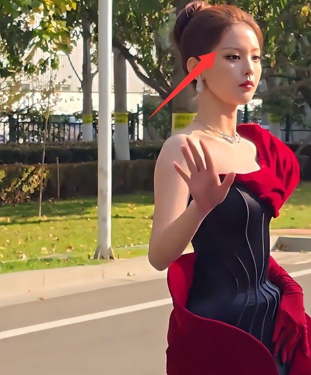 一身红黑渐变连衣裙搭配红色绑带抹胸,整体造型充满戏剧张力。 但高清画面揭示了一个致命短板:发际线严重后移。