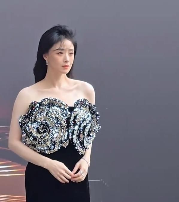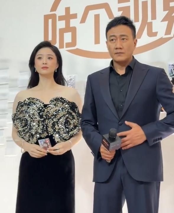 她选了一条黑色亮片拖地长裙,脚踩十厘米细跟高跟鞋,气势夺人。 即便身旁站着影帝胡军,也丝毫不落下风,尽显女王风范。