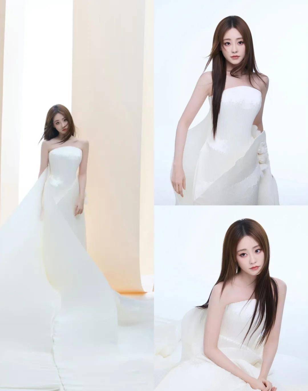 一袭纯白拖尾礼服登场,那瞬间宛如新娘步入婚礼殿堂。 肤色白里透粉,整体状态精致动人,光彩照人。